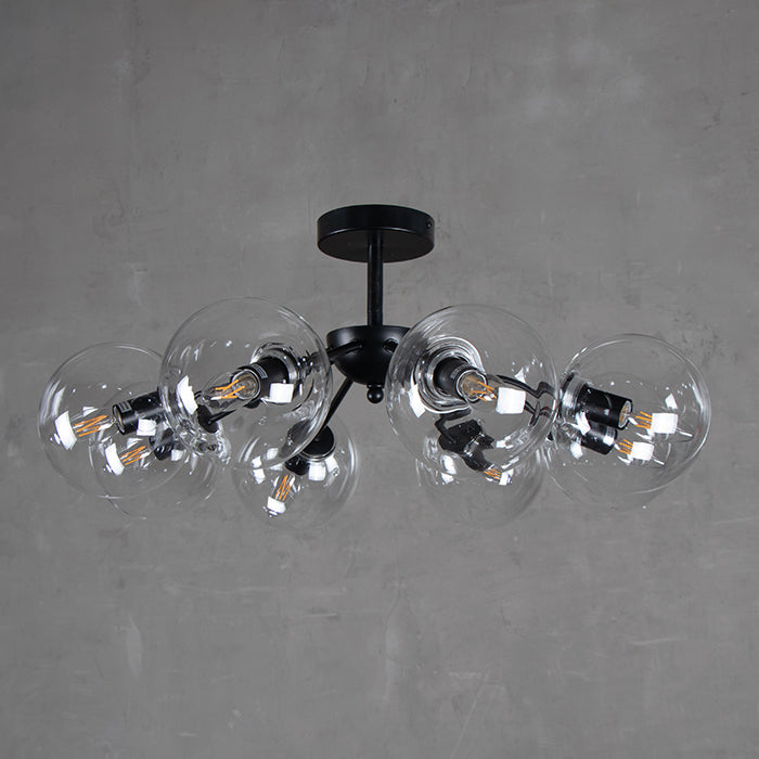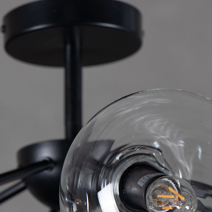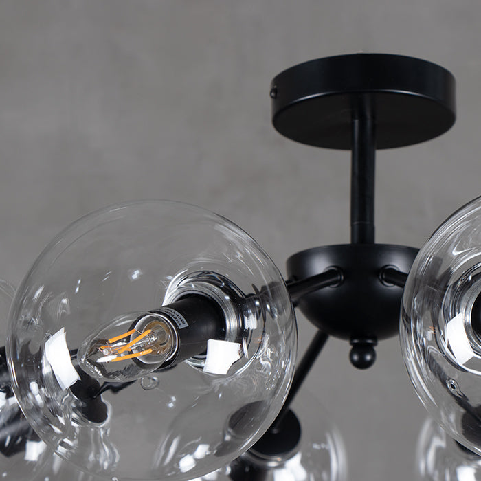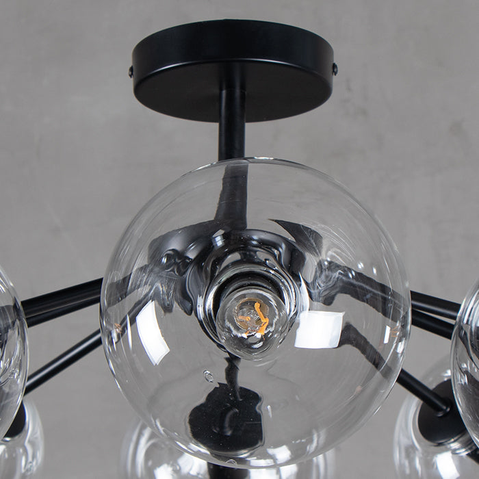 Lámpara de colgar con estructura de acero en negro con 8 terminales de luz con esferas de cristal translúcido.