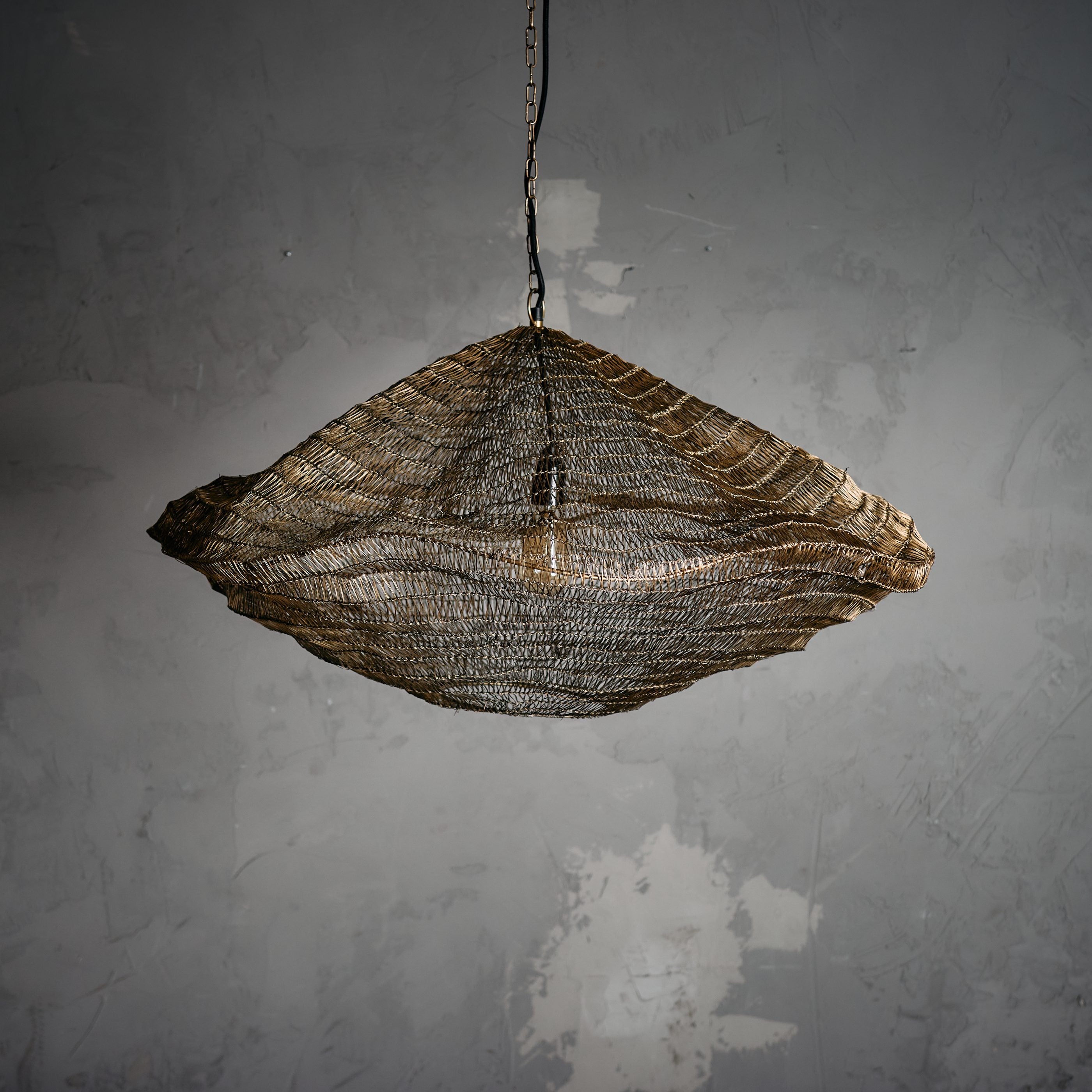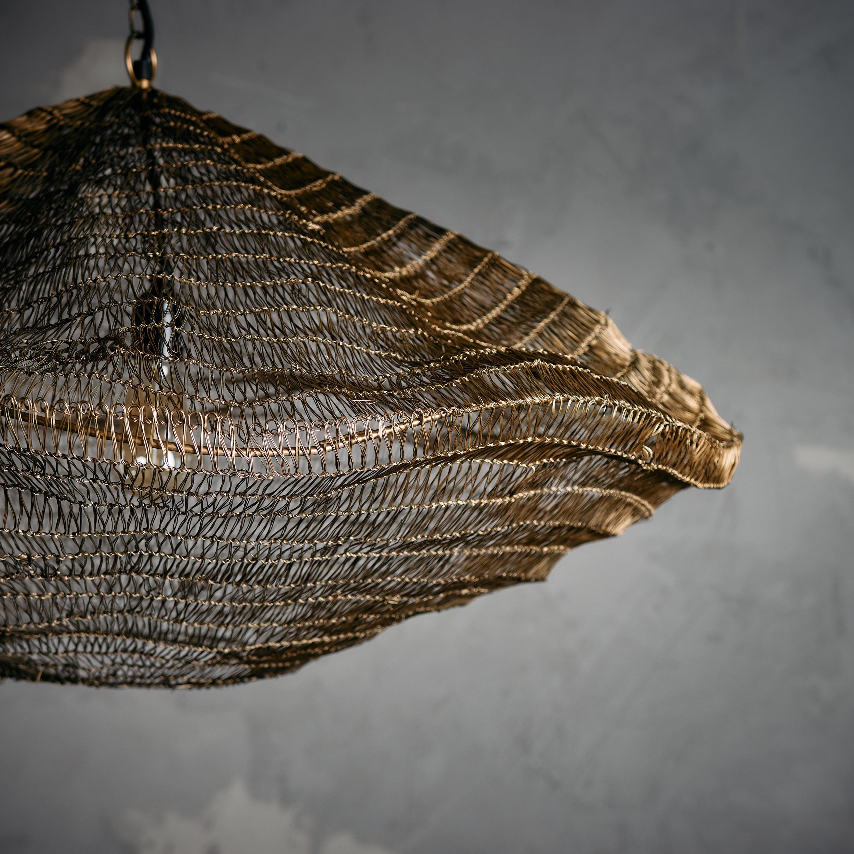 Lampara de colgar tejida en alambre metálico con terminación en tono bronce, formando un entramado orgánico que deja entrever la ampolleta interior, jugando con la luz y las sombras de forma escultural.