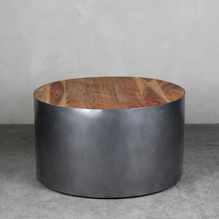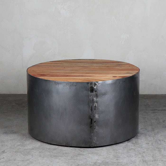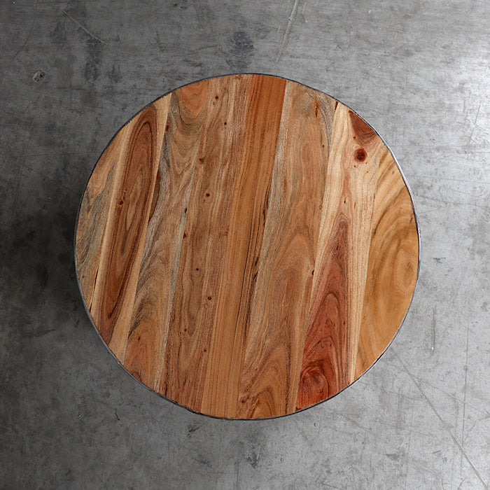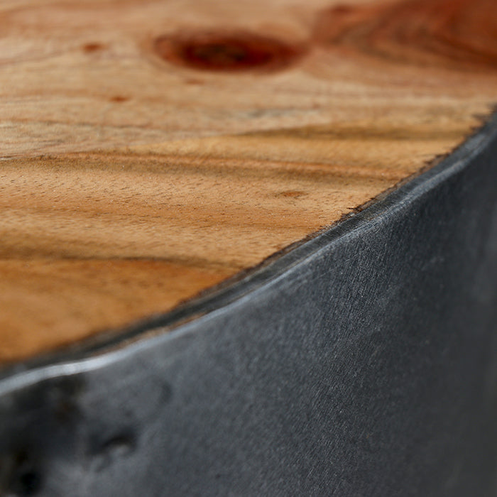 Mesa con cubierta de madera y base de metal.