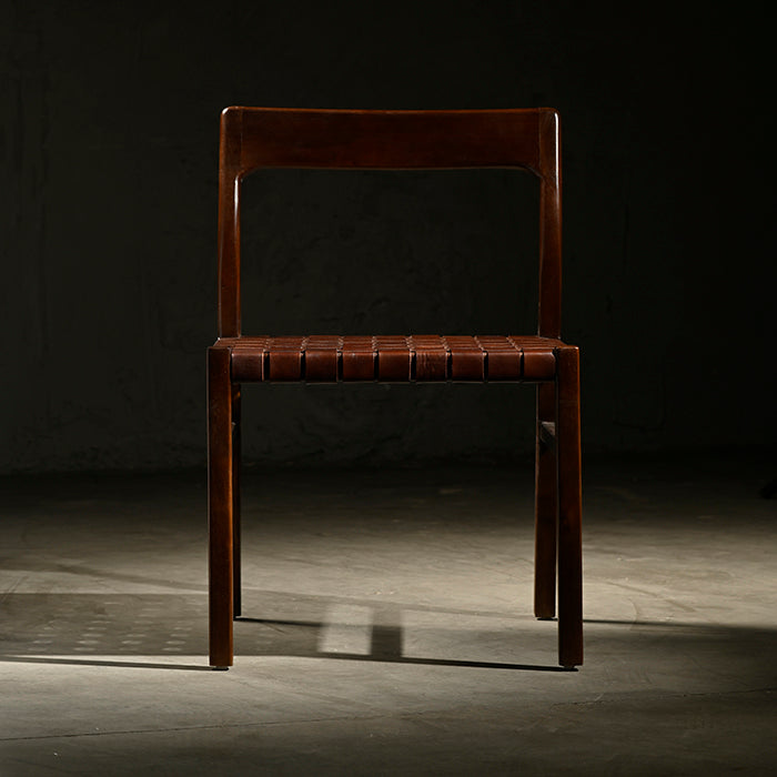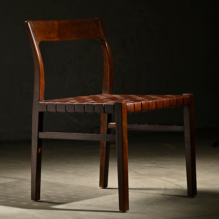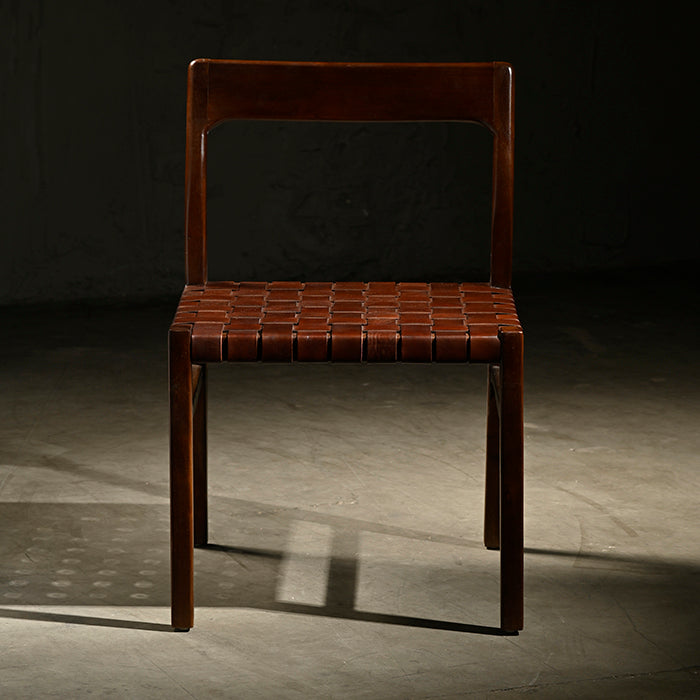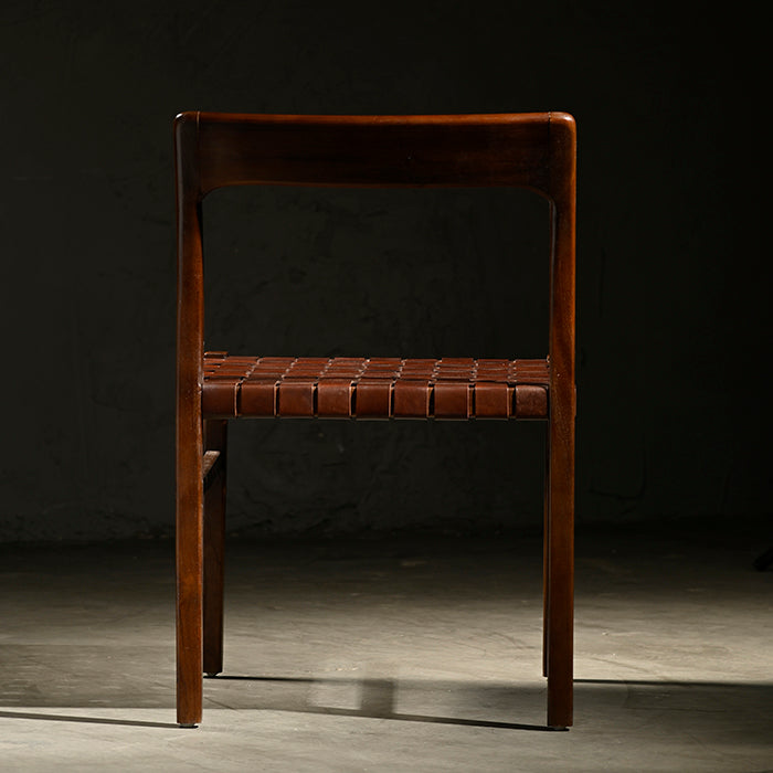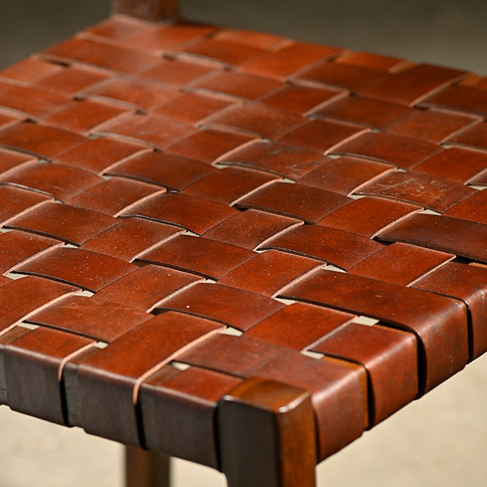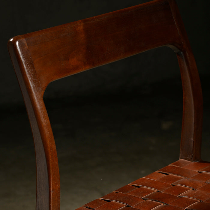 Materialidad: Madera de teca en terminación nogal y asiento tejido de cuero café.