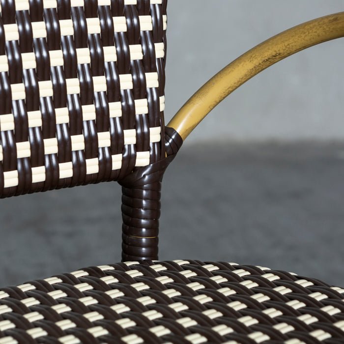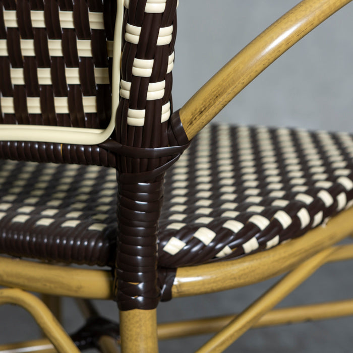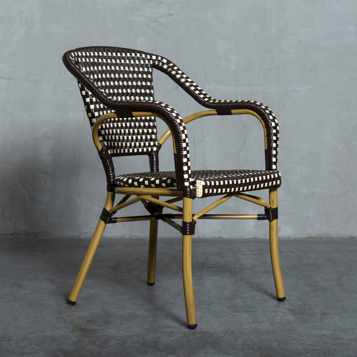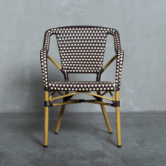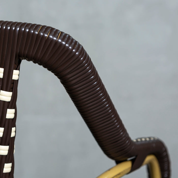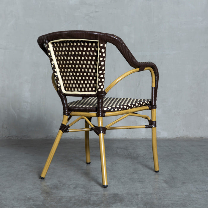 Silla de alto tráfico con estructura de aluminio y tejido de fibra sintética, siendo ideal para lugares expuestos al agua y sol.
