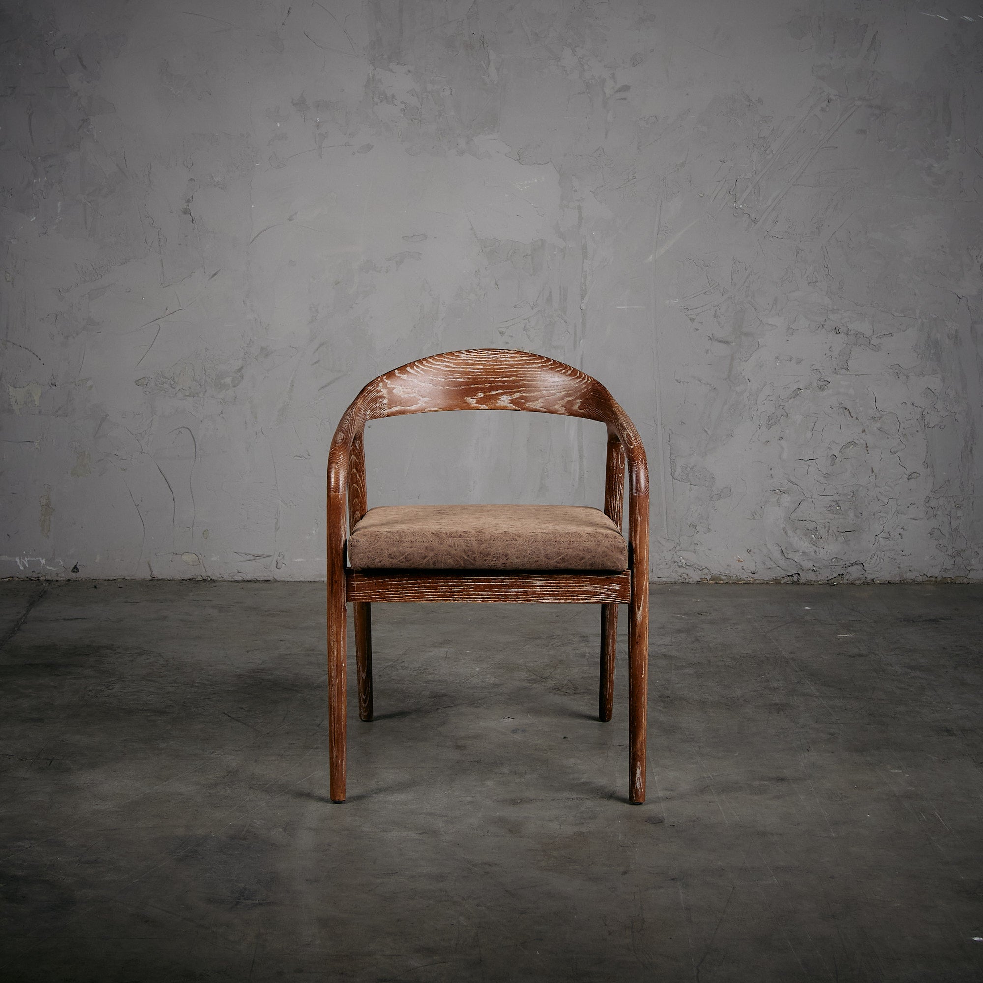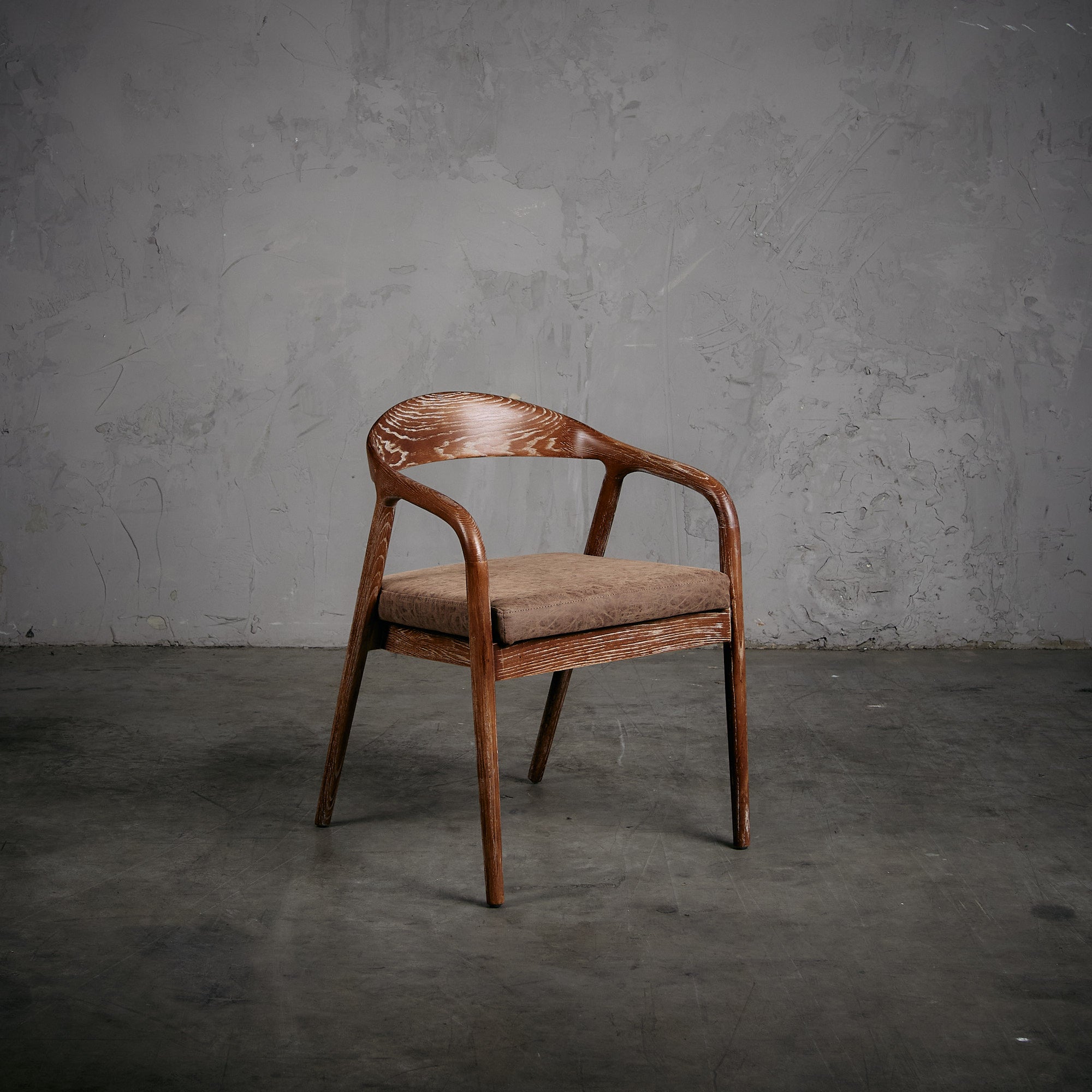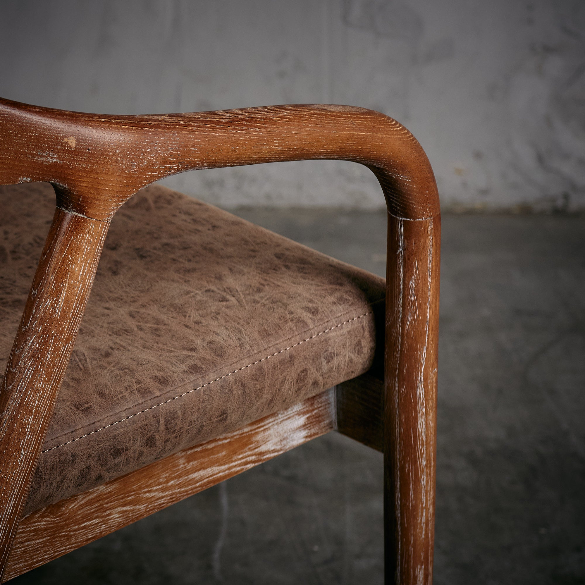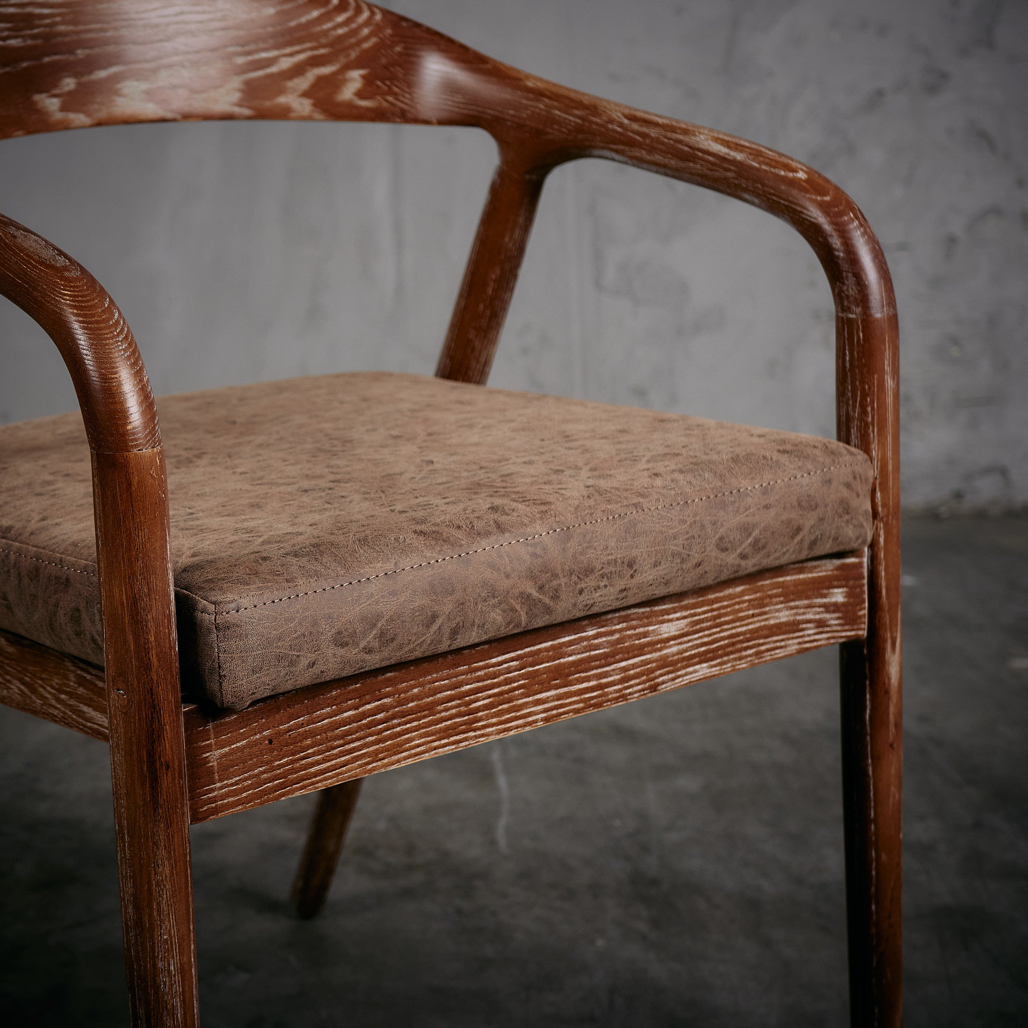 Sitial de madera de olmo en terminación nogal con tapiz de cuero PU en color café oscuro.