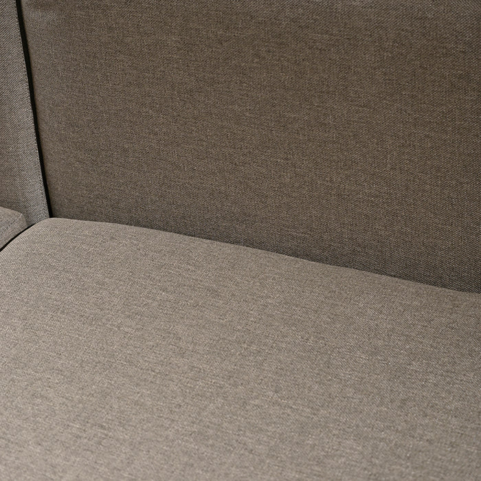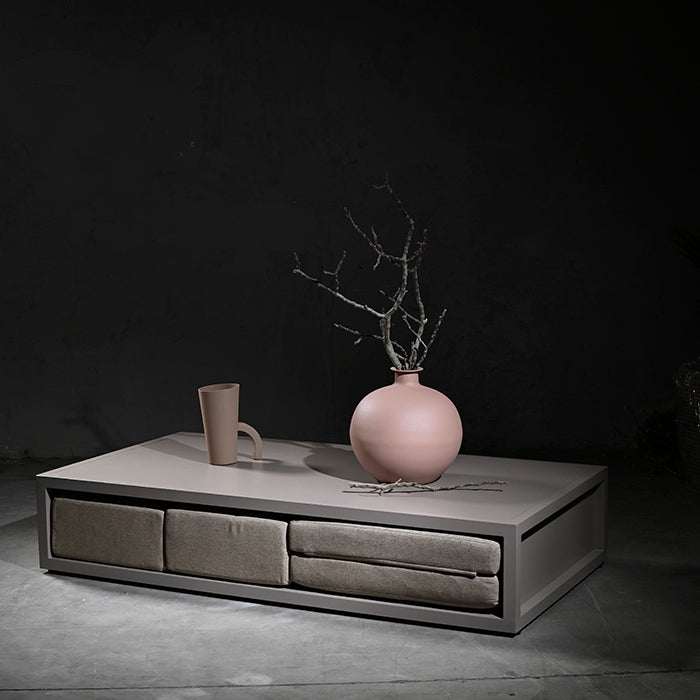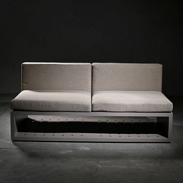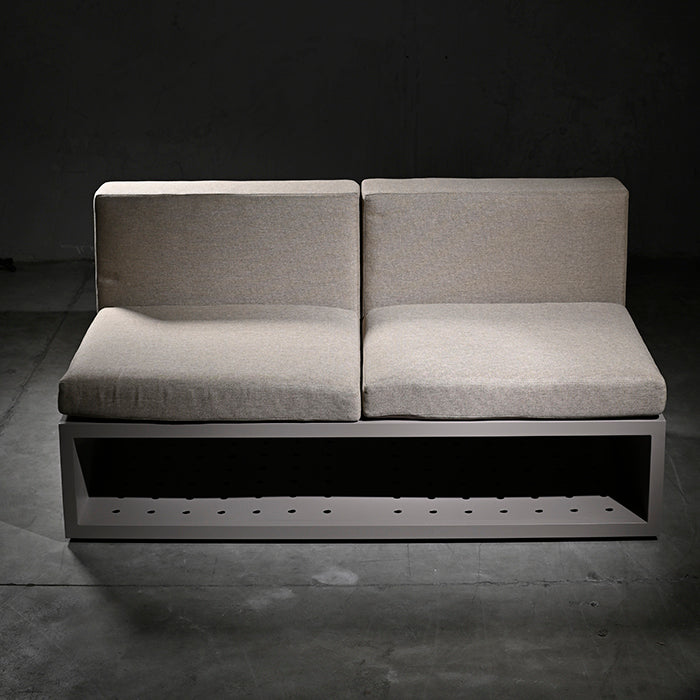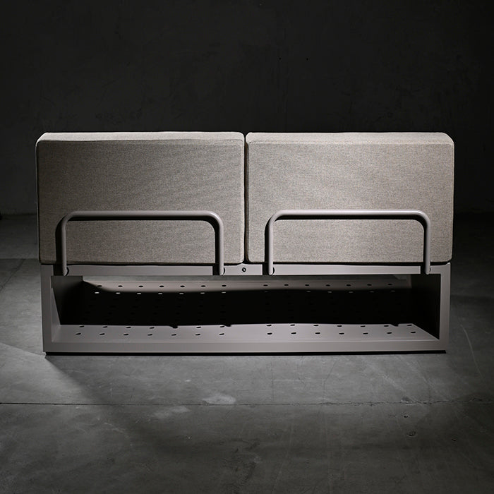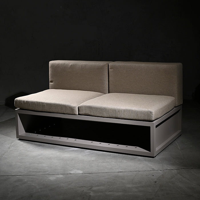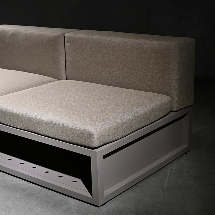 Sofá modular de aluminio en terminación taupe, los cojines se pueden guardar en la estructura.